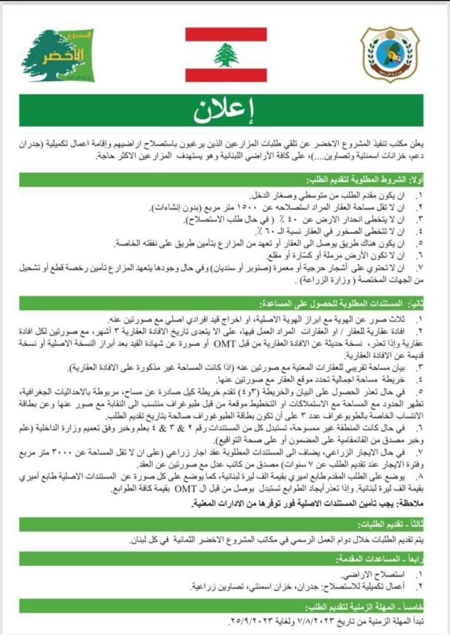 للتقدم بالطلبات يرجى إكمال المستندات في الصورة المرفقة أعلاه، وتقديمها في مكتب المشروع الأخضر لمحافظة النبطية.