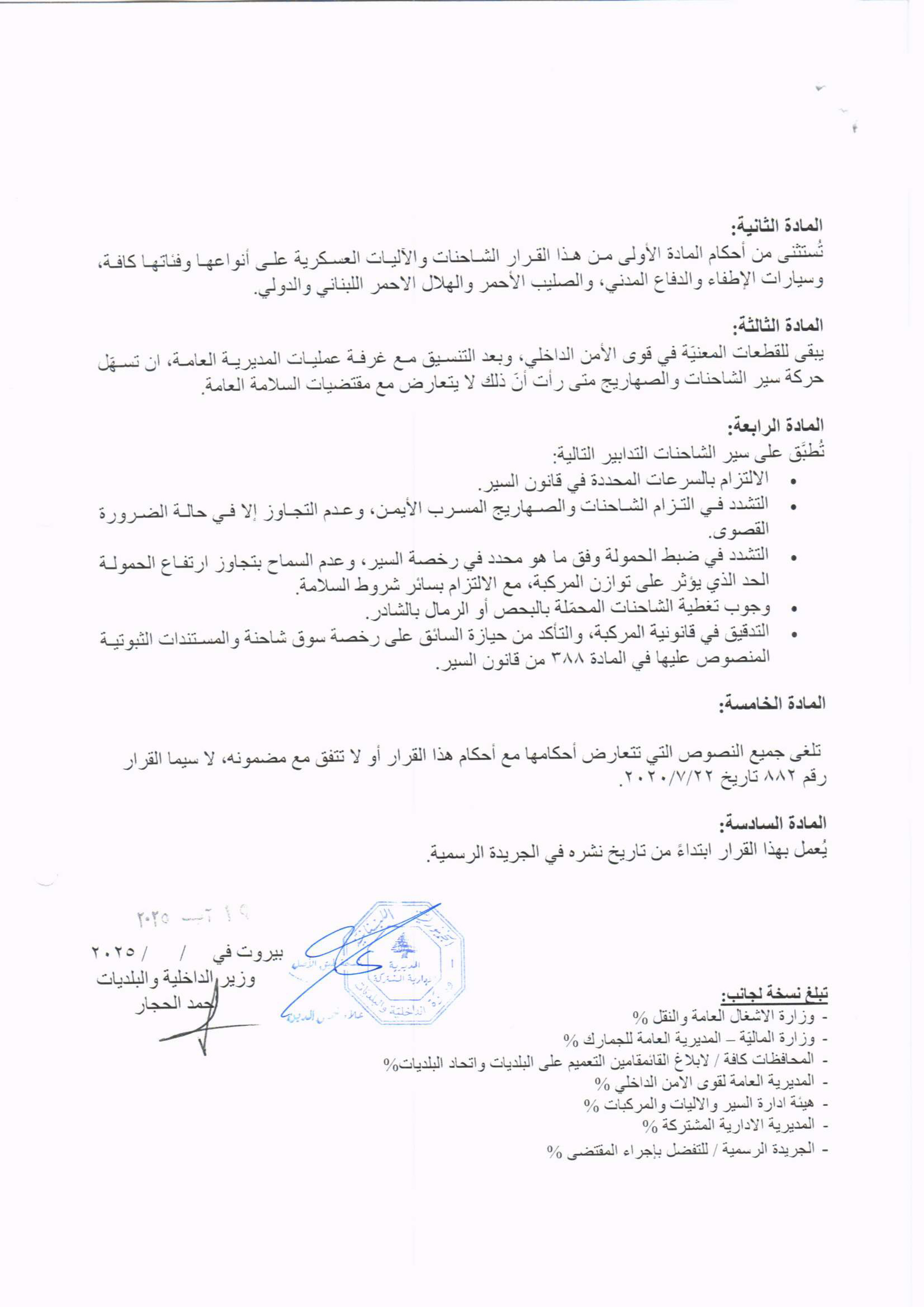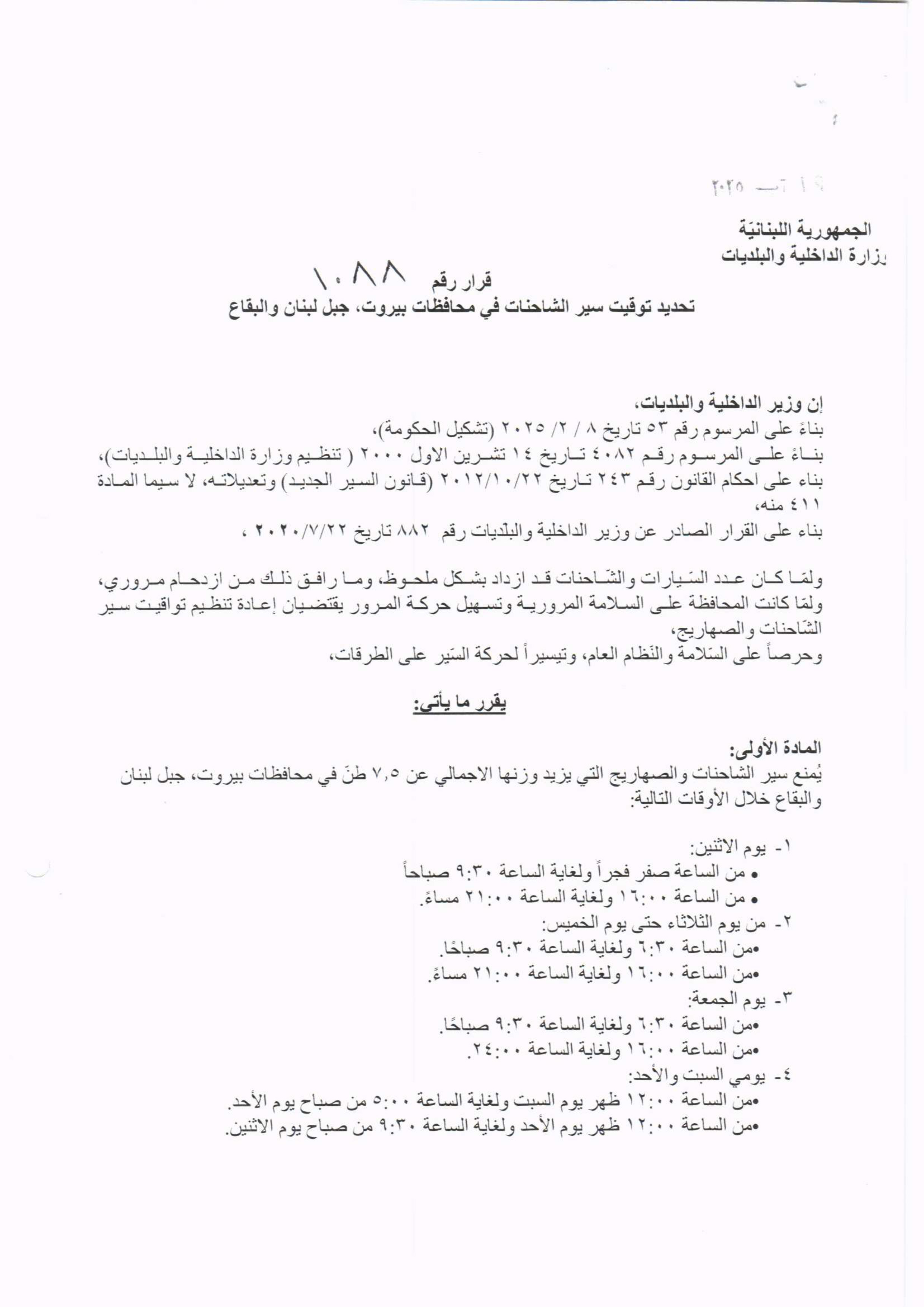 نشرت وزارة الداخلية والبلديات قرار تحديد توقيت وتدابير سير الشاحنات في محافظات بيروت، جبل لبنان والبقاع.