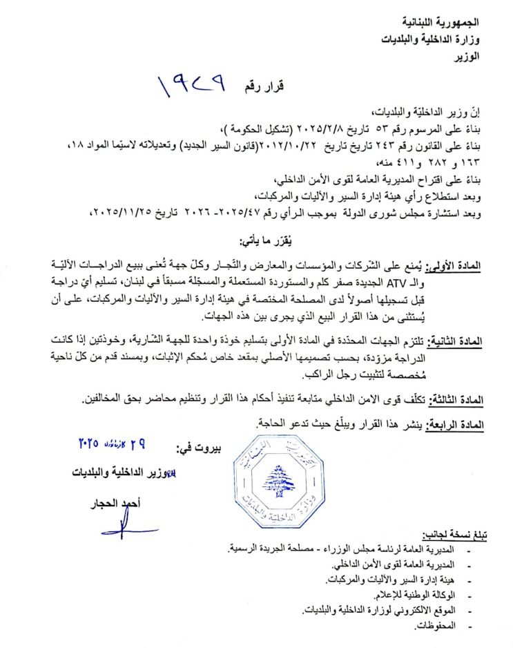 أصدر وزير الداخلية والبلديات احمد الحجار قراراً بمنع الشركات والمؤسسات والمعارض والتجار وكل جهة تُعنى ببيع الدراجات الآلية و/أو الـ ATV الجديدة منها و/أو المستوردة المستعملة في لبنان، تسليم أي دراجة قبل تسجيلها أصولًا لدى المصلحة المختصة في هيئة إدارة السير والآليات والمركبات وإلزامها بتسليم خوذة للجهة الشارية.