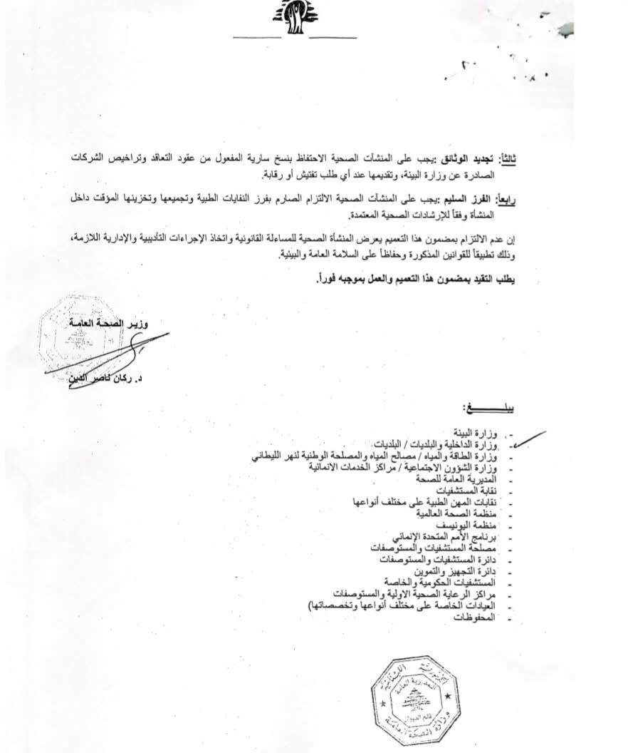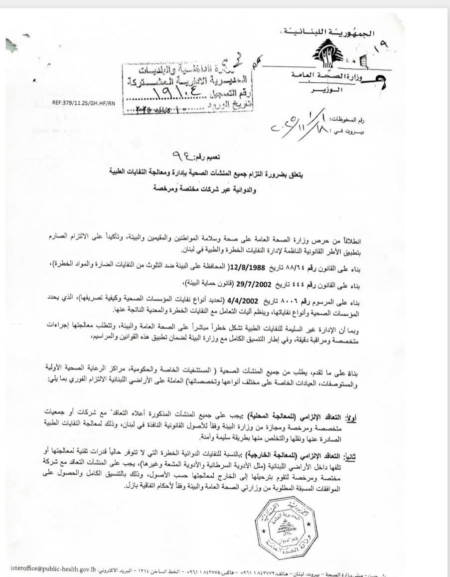 ويأتي هذا التعميم في إطار الحرص على حماية الصحة العامة والبيئة، ومنع أي تأثيرات سلبية قد تنجم عن سوء إدارة النفايات الطبية، داعيًا البلديات إلى متابعة تطبيق هذه الإجراءات والتأكد من التزام المنشآت الصحية بالمعايير المطلوبة، واتخاذ الإجراءات القانونية اللازمة تجاه المخالفين.
