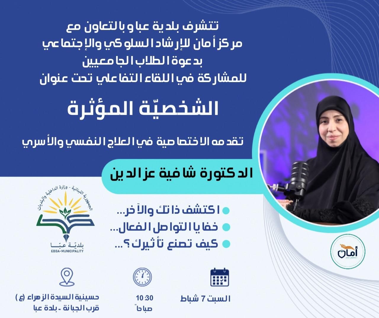 بلدية عبا ومركز أمان يدعوان الطلاب الجامعيين للقاء تفاعلي بعنوان "الشخصية المؤثرة"