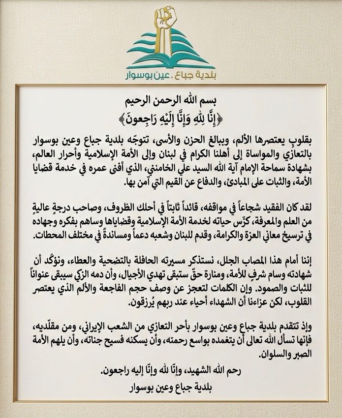 بلدية جباع وعين بوسوار تعزي الأمة الاسلامية بشهادة سماحة الإمام السيد علي الخامنئي