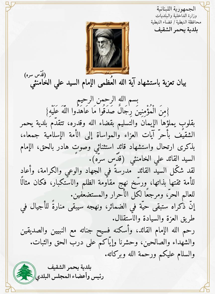 بلدية يُحمر الشقيف تنعى آية الله العُظمى الإمام علي الخامنئي