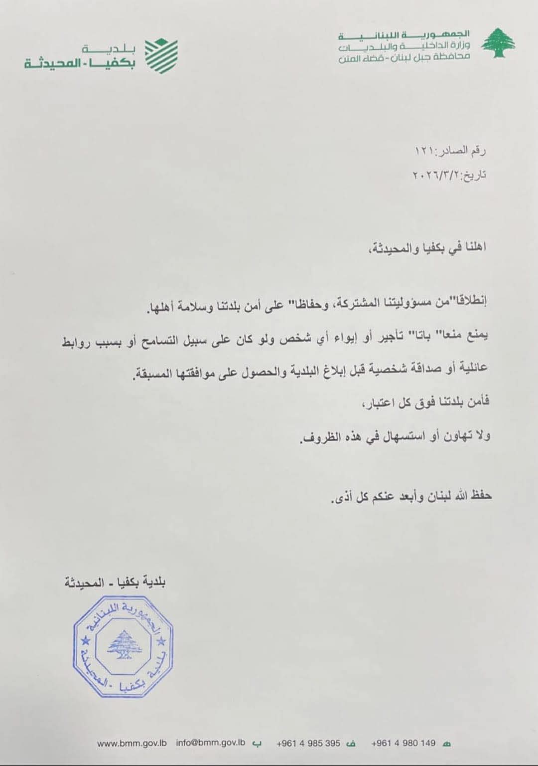 بلدية بكفيا – المحيدثة تحسم: لا إيواء ولا تأجير دون إذن مسبق