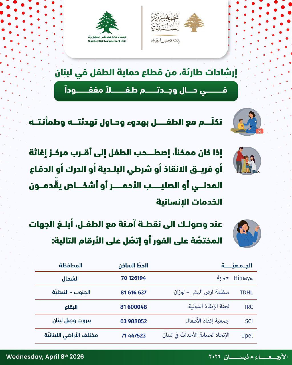 أصدر قطاع حماية الطفل في لبنان إرشادات طارئة للتعامل مع حالات العثور على طفل مفقود، في ظل الظروف الراهنة.