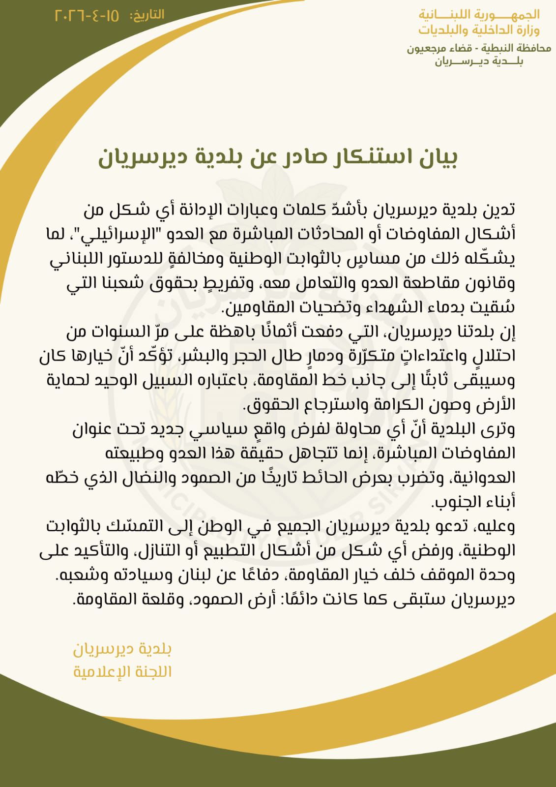 دانت بلدية ديرسريان - مرجعيون، أي شكل من أشكال المفاوضات أو المحادثات المباشرة مع "إسرائيل"، معتبرةً أنها تمسّ بالثوابت الوطنية وتخالف الدستور اللبناني وقانون مقاطعة العدو، وتشكل تفريطًا بحقوق اللبنانيين.