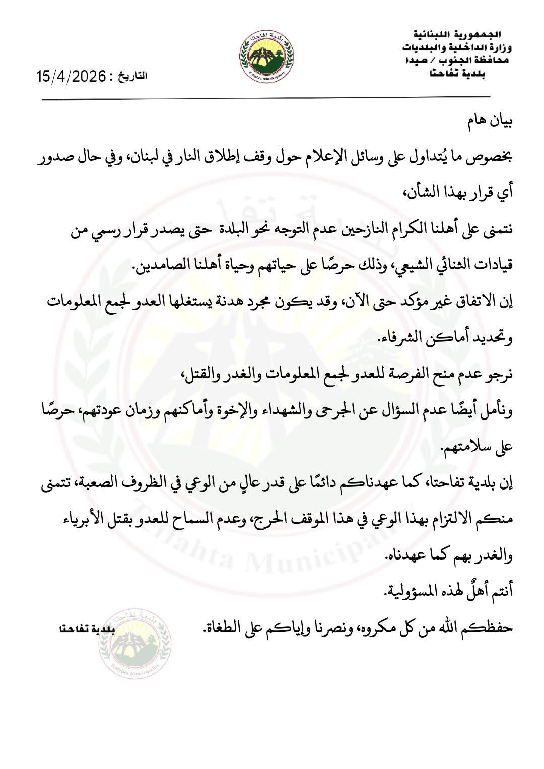 دعت بلدية تفاحتا - صيدا، الأهالي النازحين إلى عدم التوجه نحو البلدة، في ظل ما يتم تداوله حول وقف إطلاق النار، وذلك إلى حين صدور قرار رسمي من الجهات المعنية.