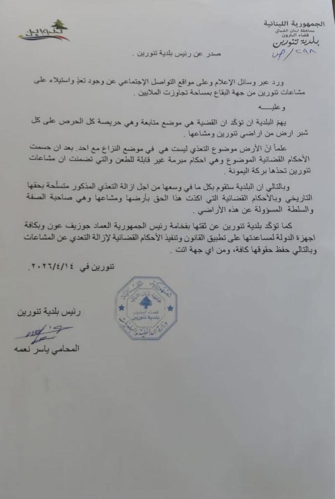 وأكدت البلدية حرصها على حماية كامل أراضي تنورين ومشاعاتها، مشيرةً إلى أن الأرض موضوع التعدّي ليست موضع نزاع، بعدما حُسمت القضية بأحكام قضائية مبرمة غير قابلة للطعن، حدّدت مشاعات تنورين وصولًا إلى بركة اليمونة.