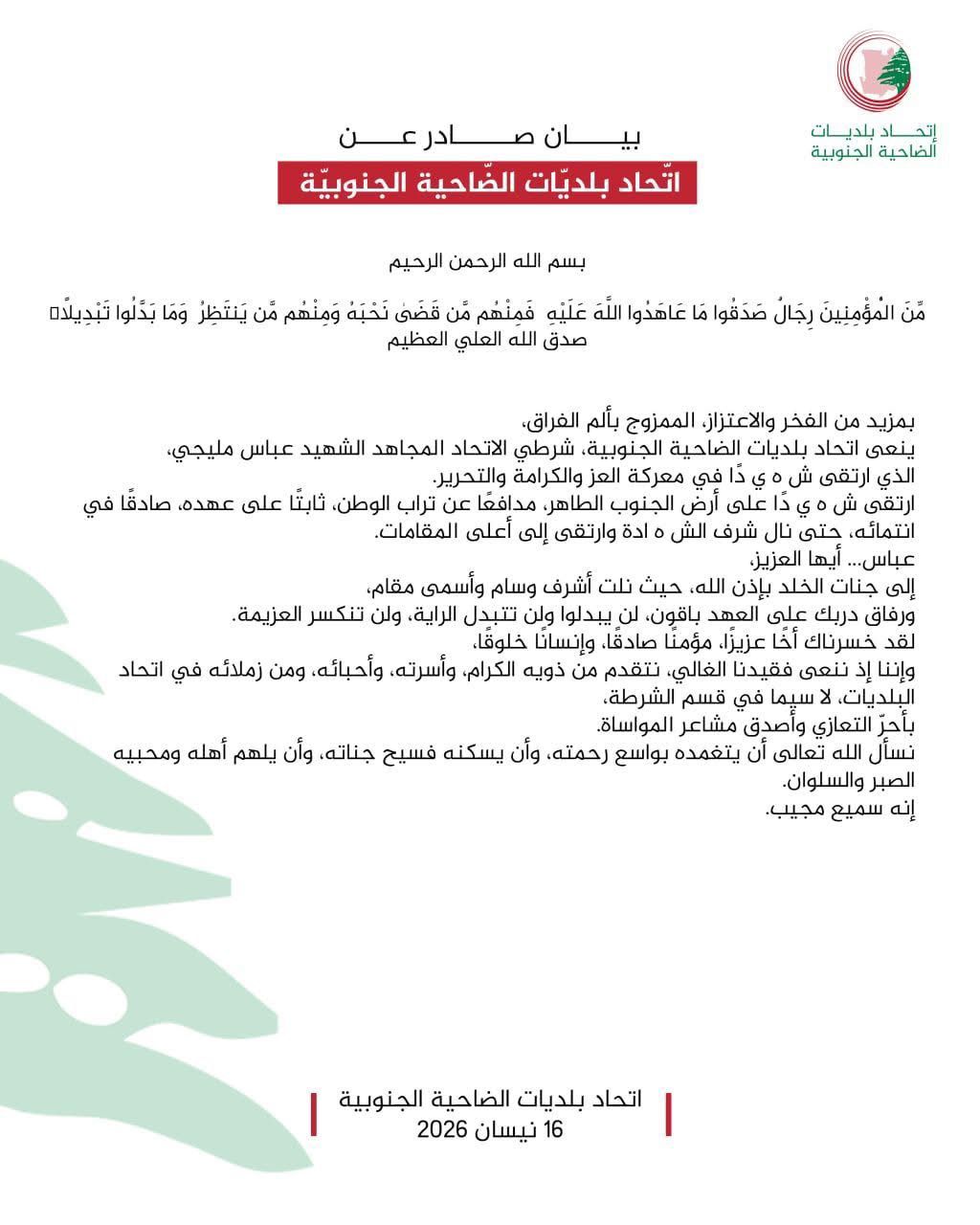 نعى اتحاد بلديات الضاحية الجنوبية الشرطي عباس مليجي، الذي ارتقى شهيدًا خلال مشاركته في المواجهات الأخيرة في جنوب لبنان.