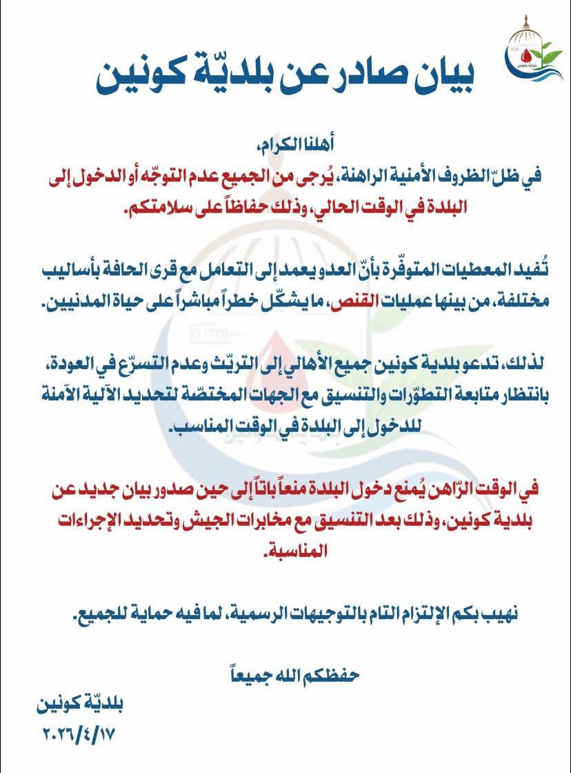 وأكدت بلدية كونين أن دخول البلدة ممنوع منعًا باتًا في الوقت الحالي، إلى حين صدور بيان جديد بعد التنسيق مع مخابرات الجيش وتحديد الإجراءات اللازمة.