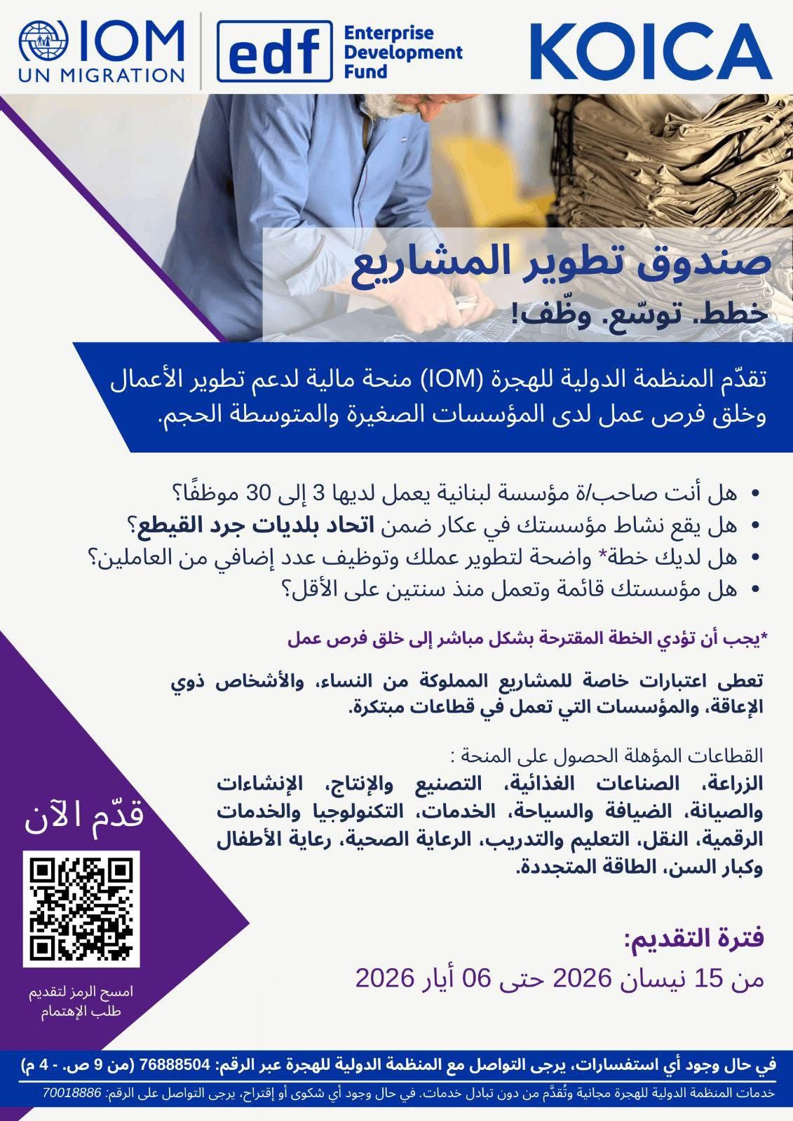أعلنت المنظمة الدولية للهجرة (IOM)، بالتعاون مع اتحاد بلديات جرد القيطع - عكار، عن إطلاق برنامج منح يهدف إلى دعم وتوسيع المؤسسات الصغيرة والمتوسطة ضمن نطاق الاتحاد.