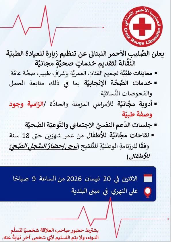 أعلنت بلدية علي النهري - زحلة، أن الصليب الأحمر اللبناني سيؤمّن خدمة العيادة الطبية النقالة ليوم واحد، وذلك يوم الاثنين 20 نيسان 2026 ابتداءً من الساعة التاسعة صباحًا في مبنى البلدية، في إطار تعزيز الرعاية الصحية لأبناء البلدة.