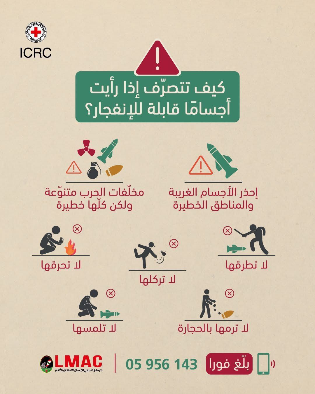 ودعا إلى عدم لمس هذه الأجسام أو تحريكها أو رميها أو حرقها أو الاقتراب منها، لما تشكّله من خطر مباشر على السلامة العامة، مع التأكيد على أهمية الابتعاد عن الأماكن المشبوهة.