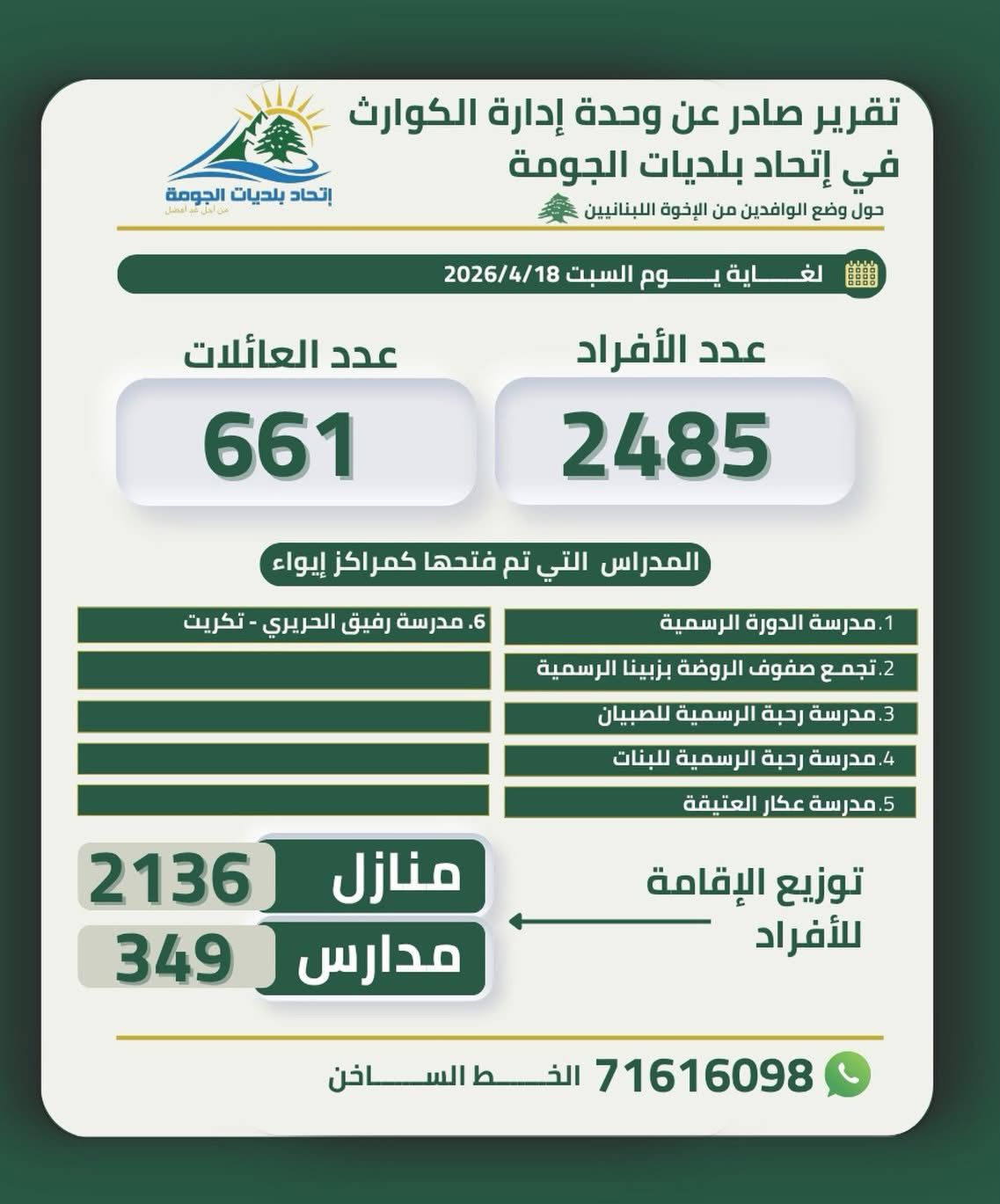 صدر عن وحدة إدارة الكوارث في اتحاد بلديات الجومة التقرير اليومي ليوم السبت 18 نيسان 2026 حول وضع الوافدين، متضمّنًا الأرقام المحدّثة وأماكن الإيواء المعتمدة.