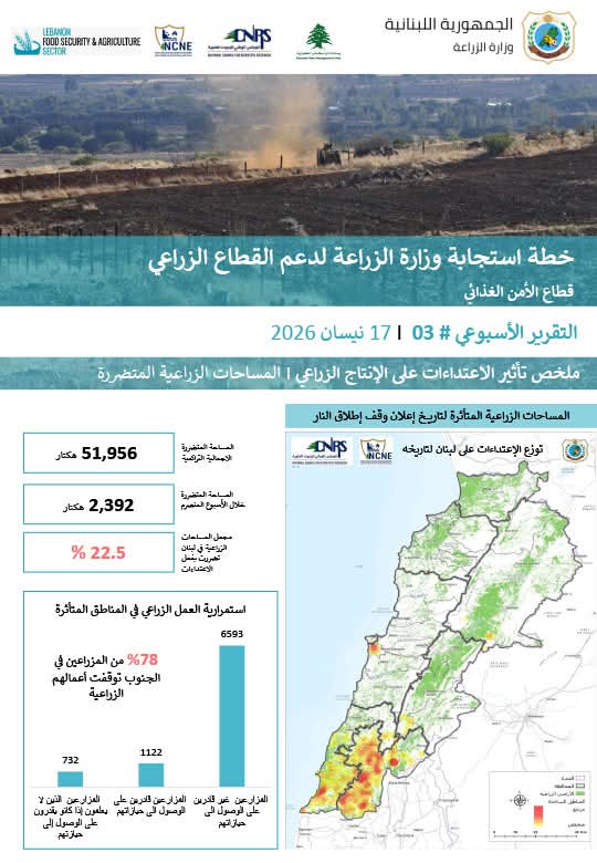 أظهر التقرير الثالث حول تأثير الاعتداءات الإسرائيلية على القطاع الزراعي في لبنان تصاعدًا خطيرًا في حجم الأضرار، مع تضرّر أكثر من 22.5% من الأراضي الزراعية، أي ما يعادل 51,956 هكتارًا، بينها 2,392 هكتارًا خلال أسبوع واحد.