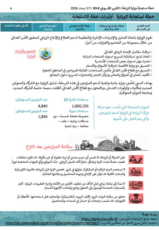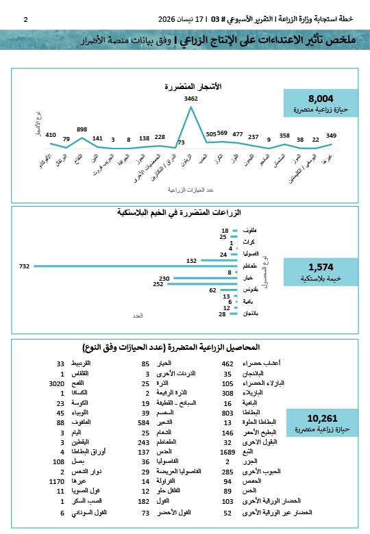 في المقابل، تواصل وزارة الزراعة تنفيذ خطة استجابة طارئة، شملت تقديم مساعدات نقدية لـ4,840 مزارعًا بقيمة تفوق 1.6 مليون دولار، ومساعدات عينية لـ1,836 مزارعًا.