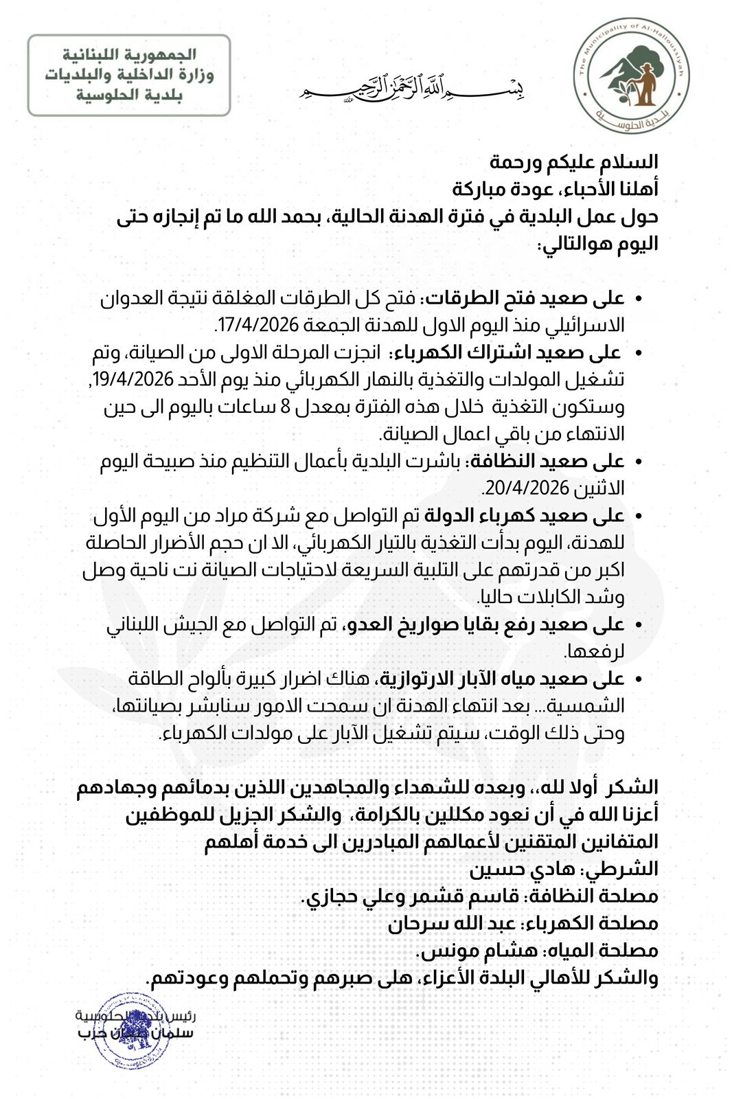 وختمت البلدية بتوجيه الشكر إلى العاملين في مختلف الأقسام على جهودهم، وإلى الأهالي على صبرهم وتعاونهم خلال هذه المرحلة.