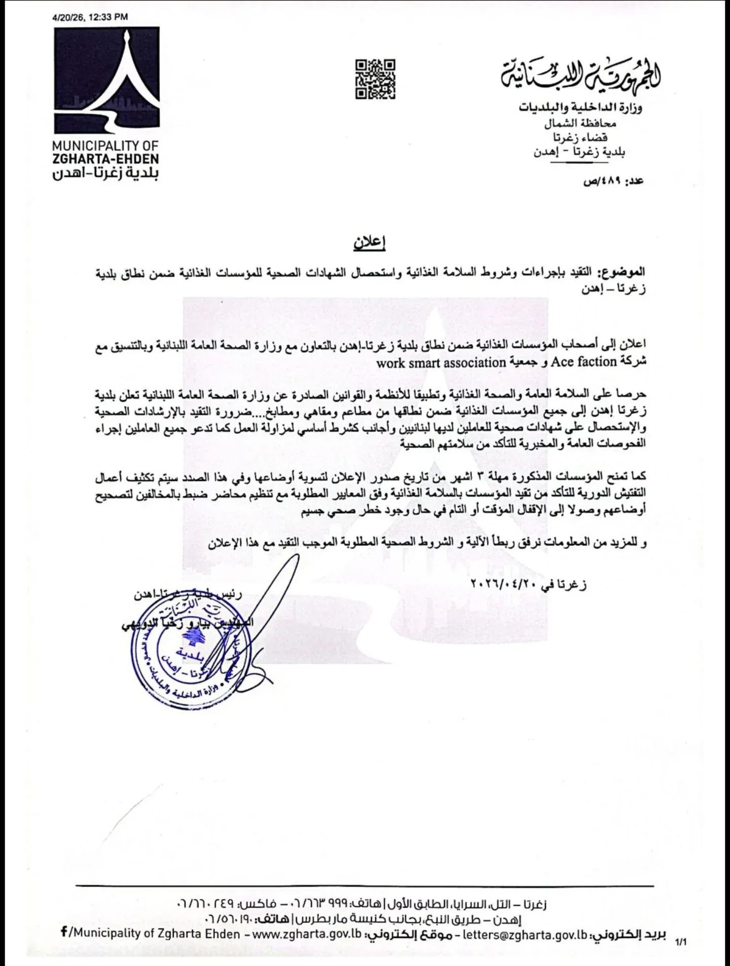 دعت بلدية زغرتا - إهدن جميع المؤسسات الغذائية ضمن نطاقها إلى التقيّد بإجراءات وشروط السلامة الغذائية والاستحصال على الشهادات الصحية للعاملين، وذلك بالتعاون مع وزارة الصحة العامة وبالتنسيق مع جهات معنية.
