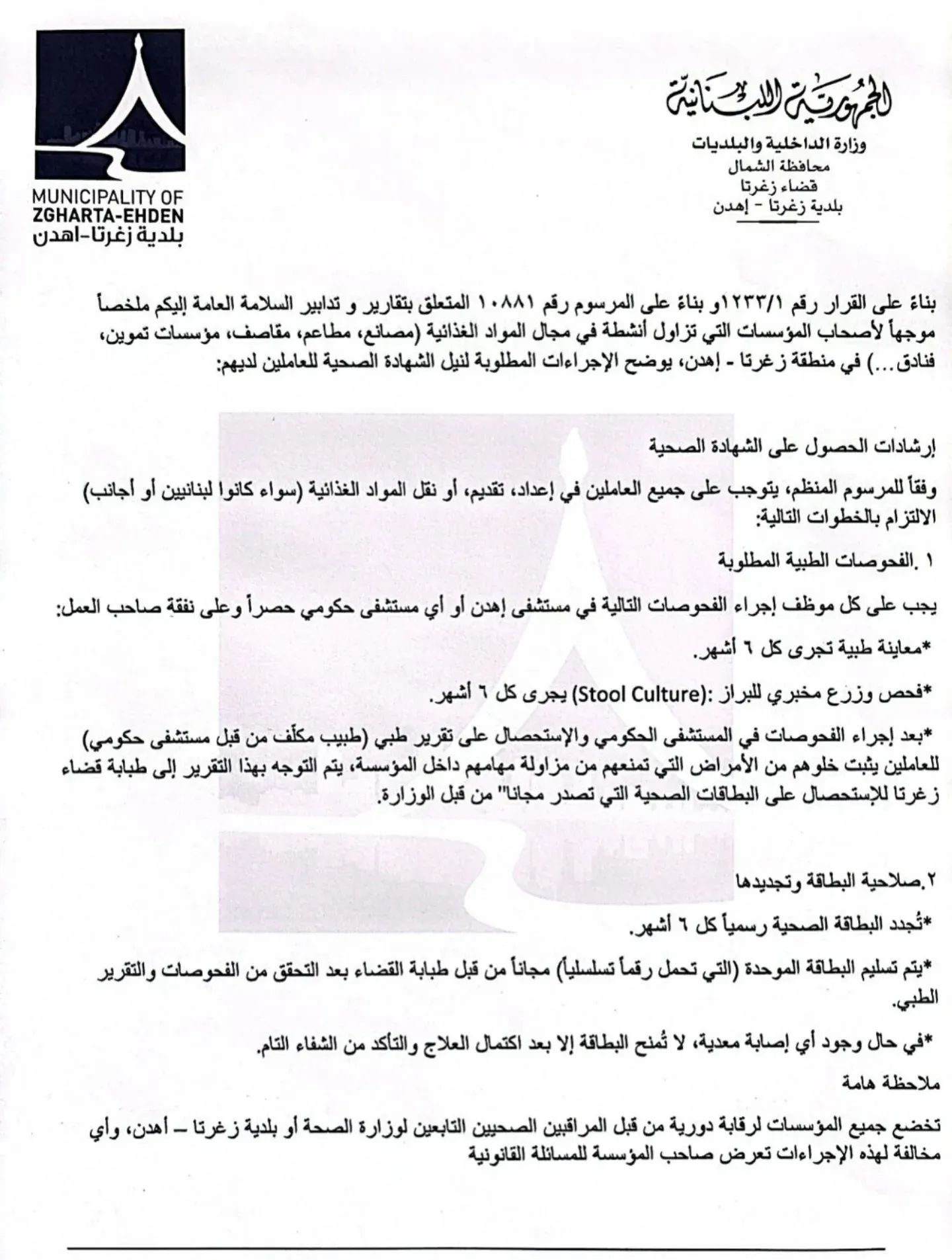 كما بيّنت آلية الحصول على الشهادة الصحية، حيث يُطلب من العاملين إجراء معاينة طبية وفحوص مخبرية كل ستة أشهر في مستشفى حكومي، على أن تُستكمل الإجراءات عبر طبابة قضاء زغرتا للحصول على البطاقة الصحية المجانية وتجديدها وفق الأصول.
