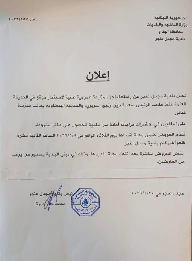 أعلنت بلدية مجدل عنجر - زحلة، عن إجراء مزايدة عمومية علنية لاستثمار موقعين في الحديقة العامة، الأول خلف ملعب الرئيس سعد الدين رفيق الحريري، والثاني في الحديقة البيضاوية بجانب مدرسة كياني.