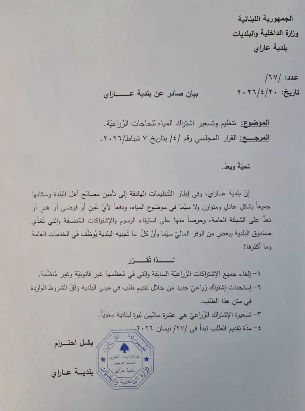 أعلنت بلدية عاراي - جزين، تنظيم وتسعير اشتراكات المياه للحاجات الزراعية، استنادًا إلى القرار المجلسي رقم 4 الصادر بتاريخ 7 شباط 2026.