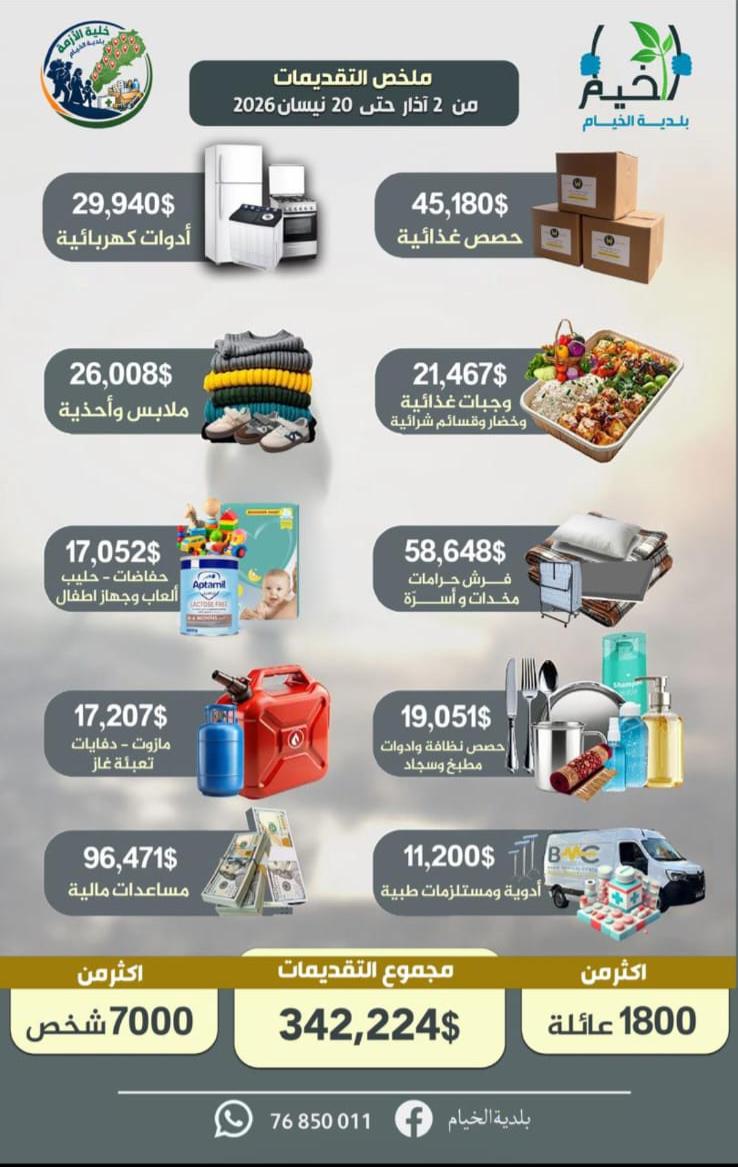 أعلنت خلية الأزمة في بلدية الخيام حصيلة التقديمات التي جرى توزيعها بين 2 آذار و20 نيسان 2026، والتي بلغت قيمتها الإجمالية 342,224 دولارًا أميركيًا، واستفاد منها أكثر من 7000 شخص، إضافةً إلى ما يزيد على 1800 عائلة.