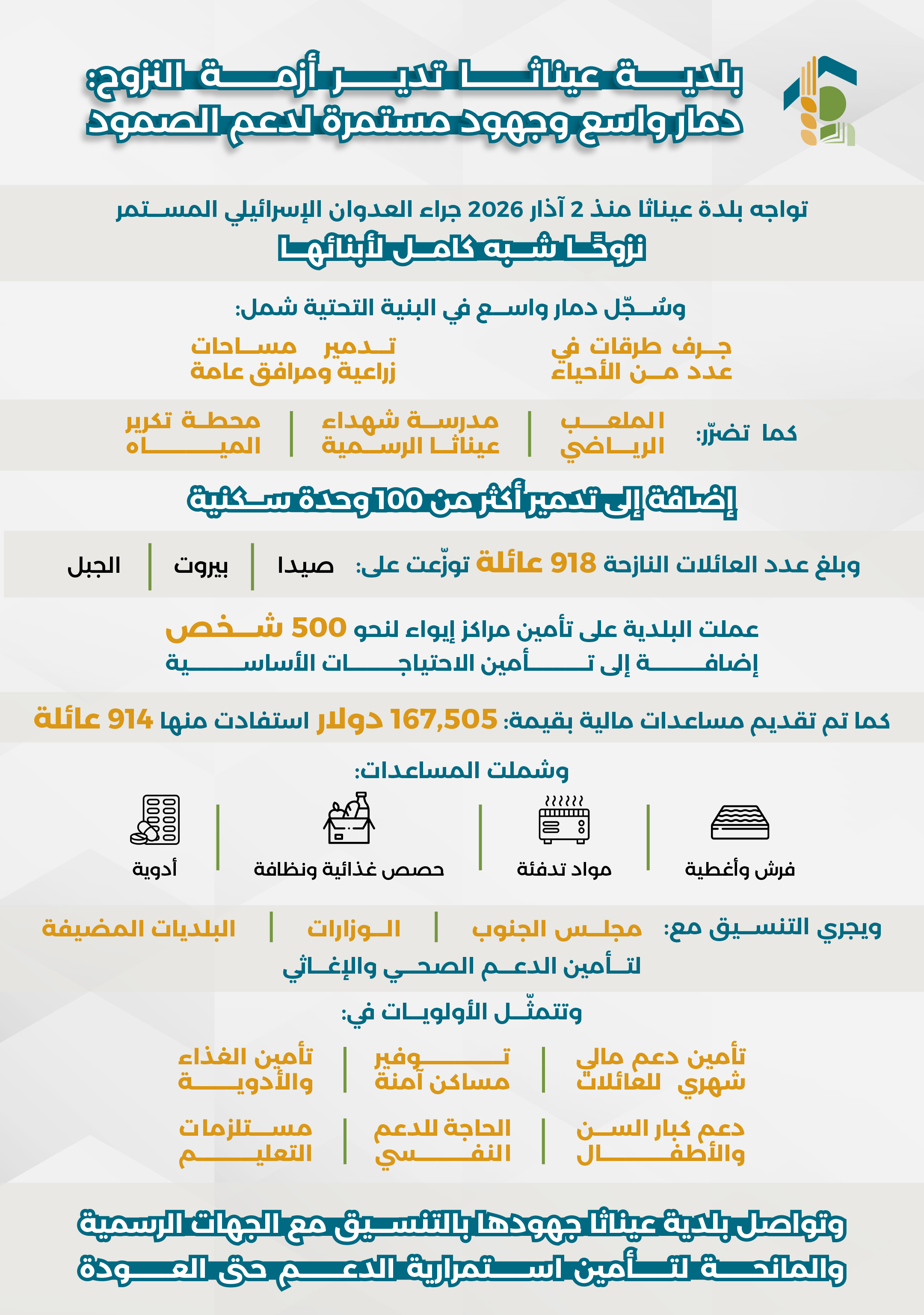 تواجه بلدة عيناثا في قضاء بنت جبيل، تداعيات قاسية جراء العدوان الإسرائيلي على لبنان، والذي أدى إلى نزوح كامل لأبنائها منذ اليوم الأول للحرب في الثاني من آذار 2026. وفي موازاة ذلك، تواصل بلدية عيناثا إدارة هذا الملف، عبر جهود متواصلة لتأمين مقومات الصمود للنازحين.