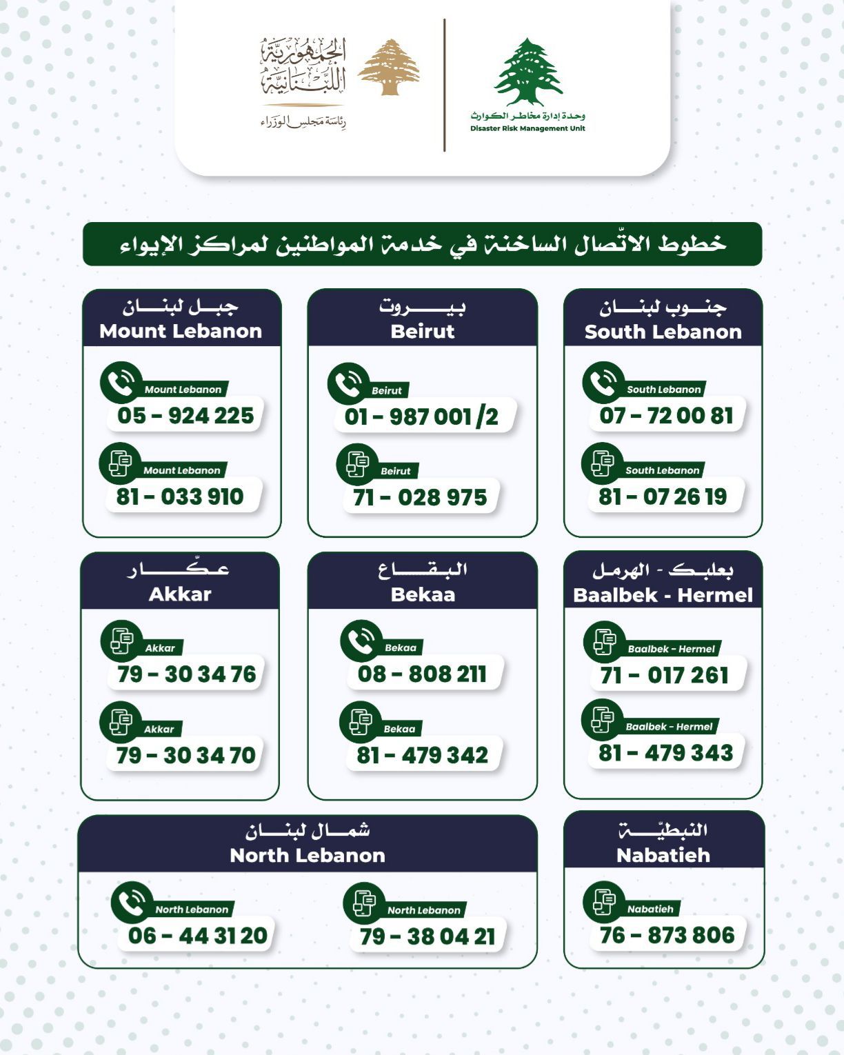 نشرت وحدة إدارة مخاطر الكوارث في السراي الحكومي خطوط الاتصال الساخنة المعتمدة في مختلف المناطق والمحافظات، والمخصّصة لتلقي اتصالات المواطنين، ولا سيّما في ما يتعلق بمتابعة أوضاع مراكز الإيواء والاستجابة للحالات الطارئة.