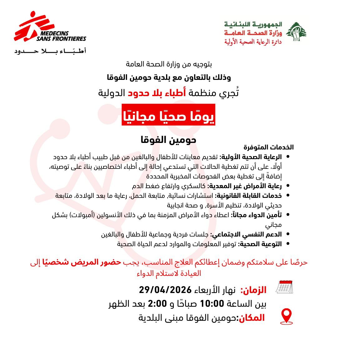 تنظّم وزارة الصحة العامة، عبر دائرة الرعاية الصحية الأولية، وبالتعاون مع بلدية حومين الفوقا - النبطية، يومًا صحيًا مجانيًا تنفّذه منظمة "أطباء بلا حدود"، وذلك يوم الأربعاء 29 نيسان 2026 في مبنى البلدية.